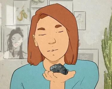 A woman with her eyes closed, holding a rock up close to her face.